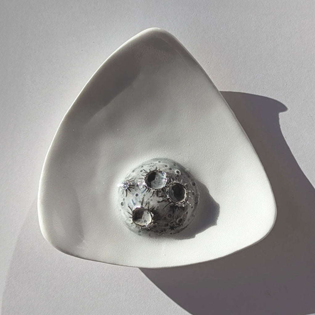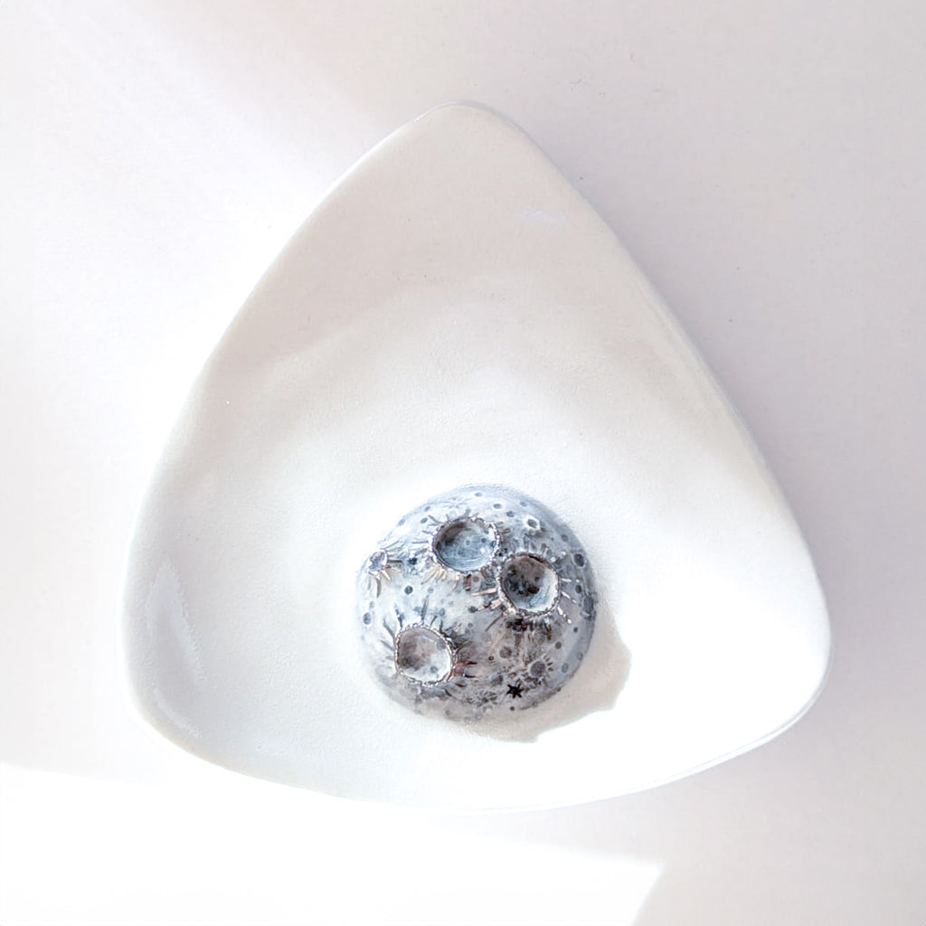 Bring a piece of the moon down to earth with this one of a kind hand-crafted porcelain catch-all. Featuring a meticulously detailed lunar surface, I hand-painted and accented in platinum overglaze, each crater and shadow is carefully rendered to capture the moon's mysterious beauty in a functional piece of art.