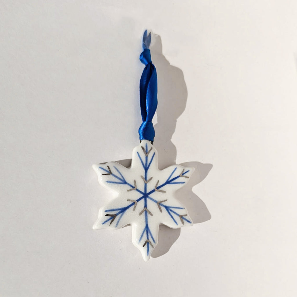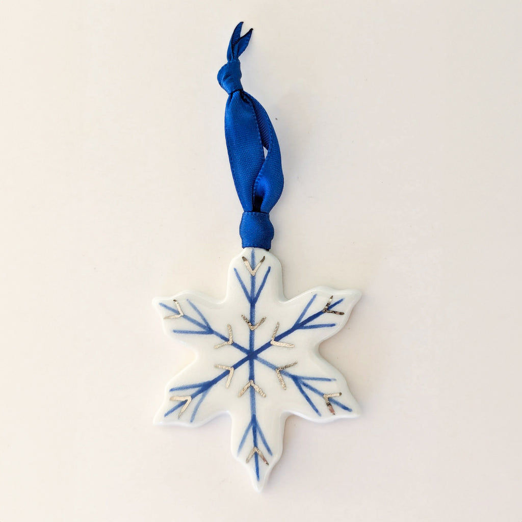 Capture winter's fleeting magic with our hand-painted porcelain snowflake ornament. This 2.5" piece is uniquely detailed with shimmering 24k gold overglaze, creating an heirloom-quality decoration that brings timeless elegance to your holiday decor. Arrives ready to gift in a protective box with blue satin hanging ribbon.