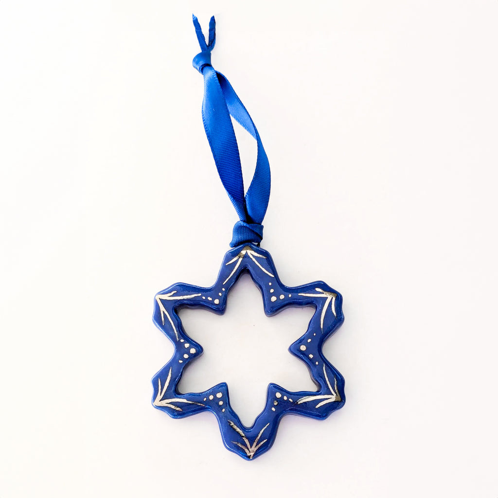 Capture winter's fleeting magic with our hand-painted porcelain snowflake ornament. This 3" piece is uniquely detailed with shimmering white gold overglaze, creating an heirloom-quality decoration that brings timeless elegance to your holiday decor. Arrives ready to gift in a protective box with blue satin hanging ribbon.