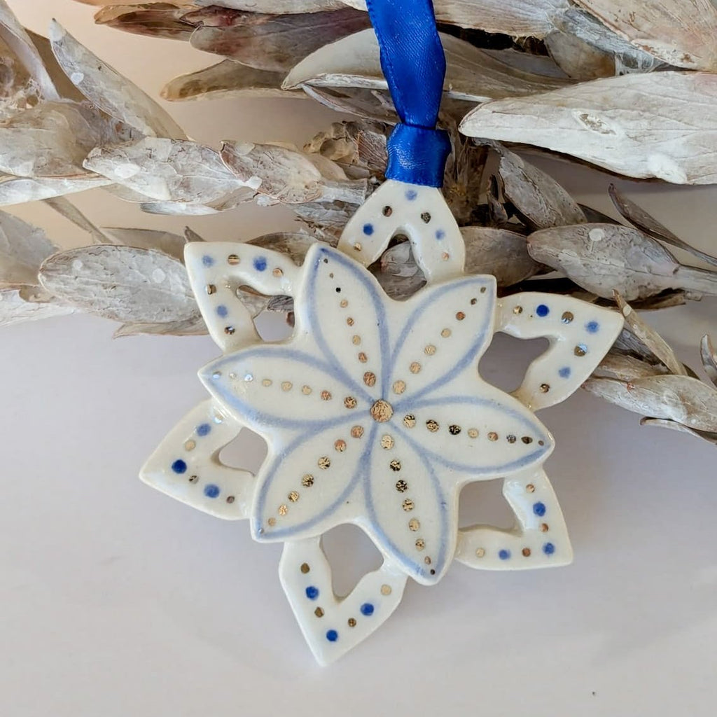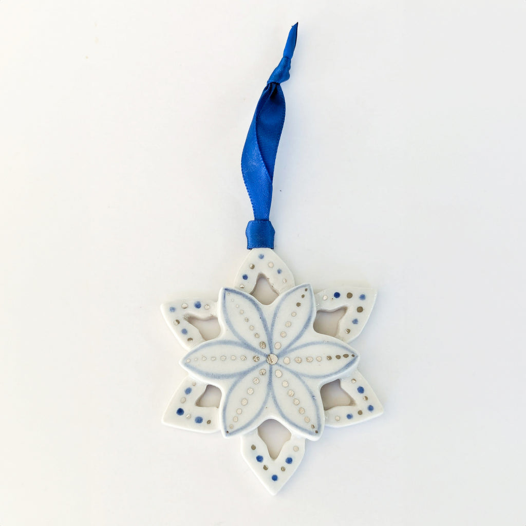 Capture winter's fleeting magic with our hand-painted porcelain snowflake ornament. This 3" piece is uniquely detailed with shimmering 24k gold overglaze, creating an heirloom-quality decoration that brings timeless elegance to your holiday decor. Arrives ready to gift in a protective box with blue satin hanging ribbon.